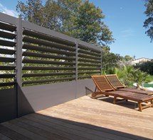 Tuinscherm of schutting van aluminium met een vulling van lamellen, planken, glas of volkern. Schutting Martinique is verkrijgbaar in verschillende breedtes en hoogtes.